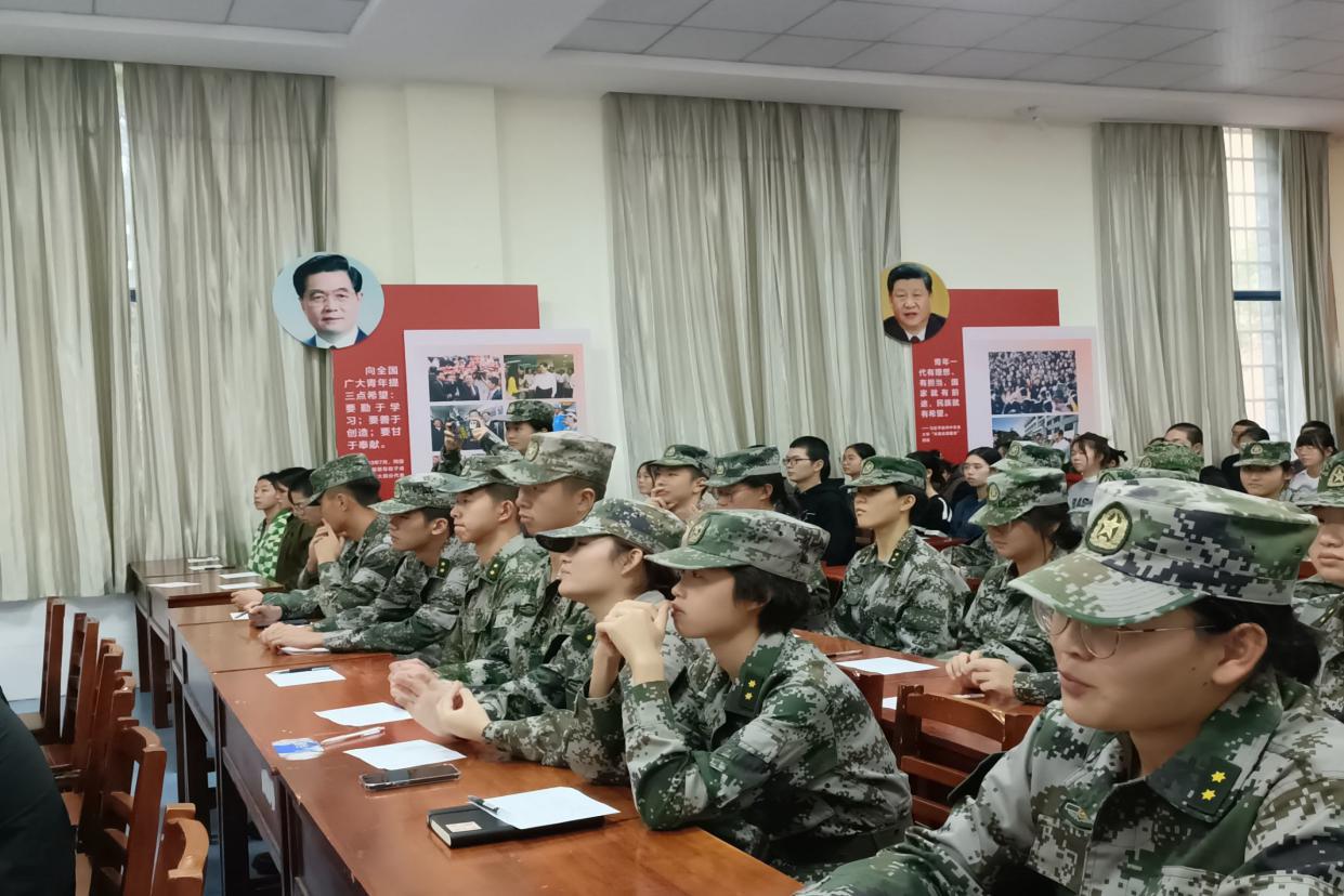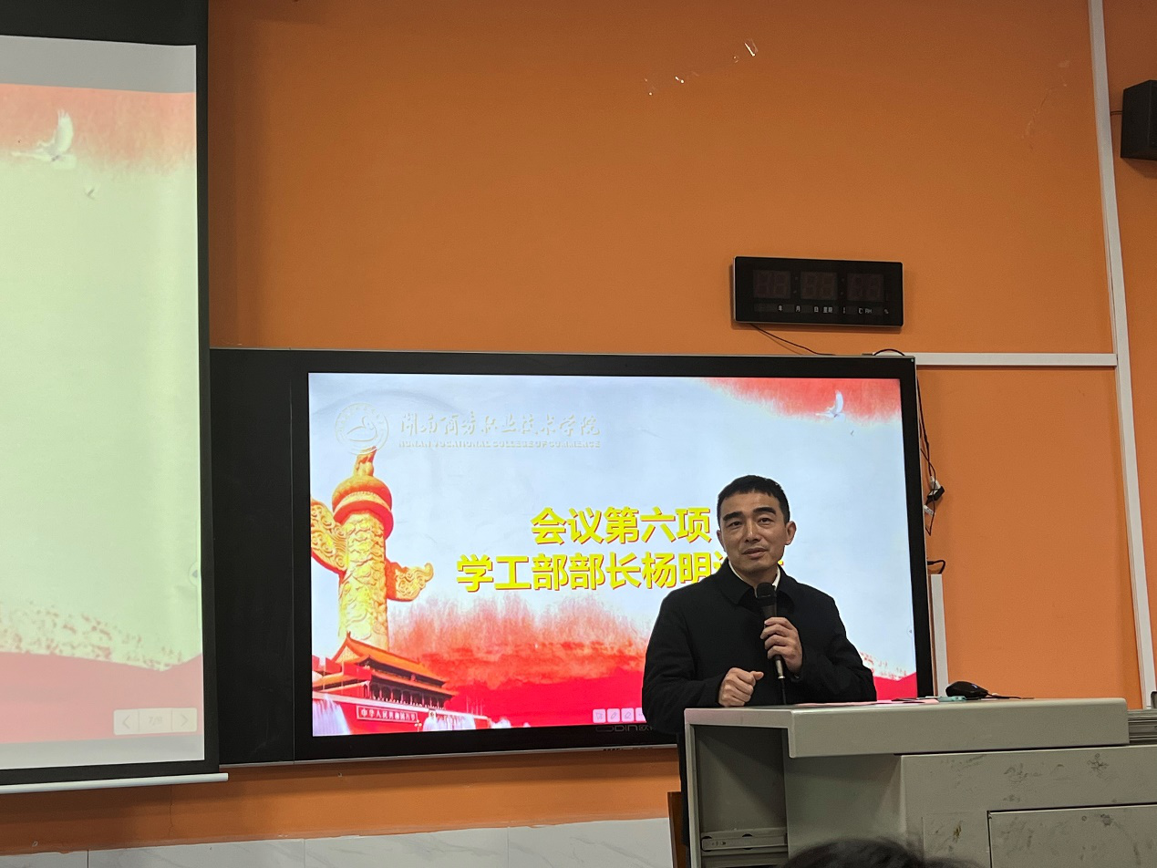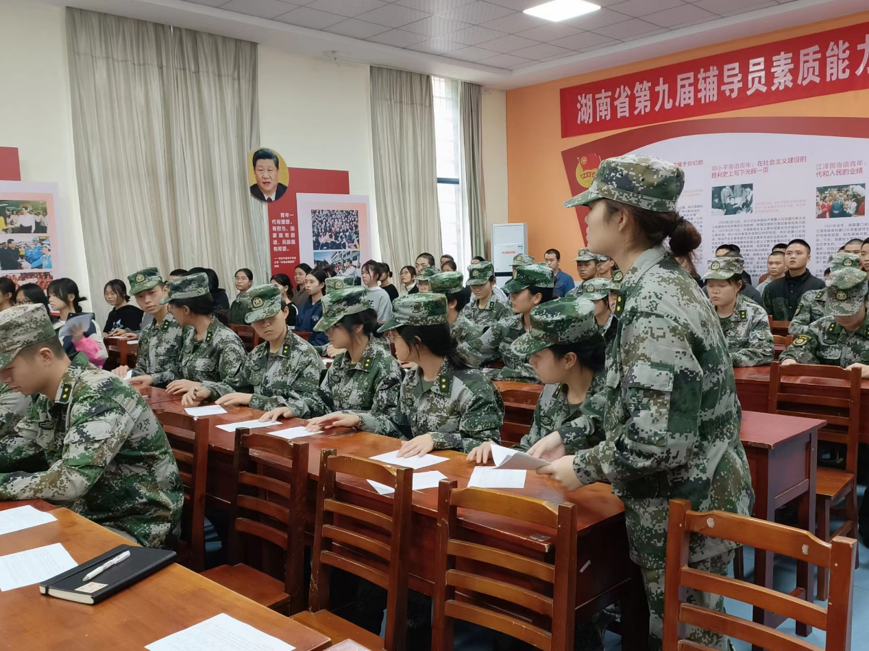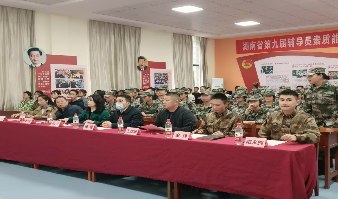 湖南商务职业技术学院于2022年11月23日下午14:30在二教-110教室举行第六届学生教官自训队管理干部换届竞聘大会,学工部部长杨明、学工部副部长张庆、帮训单位南国利剑相关领导、武装部罗永红老师、学工部戴娟老师出席会议,第五届学生教官管理干部、第五届留队人员及第六届全体队员参加会议。