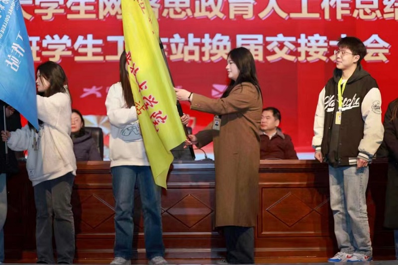 在全体与会领导、老师、同学们的见证下,第六届校易班学生工作站站长康湘婷从第五届站长陈嫔羽等手中接过代表“任务和使命”的工作站站旗,完成了新老站员的换届交接仪式。