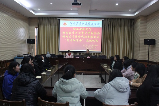 首先,唐柳荷处长对“育才助学金”进行了介绍。该助学金由湖南省教育厅联合湖南育才关心青少年基金会和湖南育才保险代理有限公司共同捐资,受助对象为购买了湖南育才保险代理有限公司保险业务的高校的贫困学生。湖南省教育厅分配给我校20个受助名额。按照省教育厅相关文件提出的“评选对象尽量与已经接受其他途径资助的对象不重复”的要求,我校此次“育才助学金”在未获得国家助学金或校级助学金,但参与勤工助学的家庭经济较困难的学生中评选。经个人申报、二级学院审核、学校学生资助管理中心审定,评选出20名受助学生。