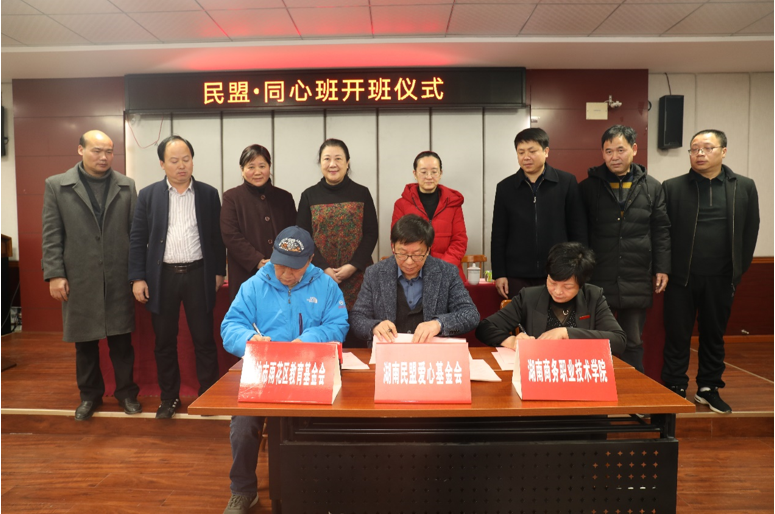 省政协副秘书长、民盟省委会专职副主委胡颖,民盟省委社会服务工作委员会主任、长沙市雨花区教育基金会理事长吴承志,湖南民盟爱心基金会理事长、湖南信息学院董事长陈登斌,民盟省委会社会服务处处长陈雅云及该院院长李定珍,副院长易兰华,党委委员、宣传统战部部长聂振华等出席开班仪式。“我院要充分利用自身资源、借助社会力量,让更多贫困学子接受教育”开班仪式上,湖南商务职院院长李定珍对民盟湖南省委及社会各界力量对我院贫困助学工作的大力支持表示衷心感谢。她希望,同学们能成长成才,将感恩之心、报恩之情转化为奋发之志、动力之源,将爱心不断传递下去,报效祖国,回馈社会。据悉,从2009年开始,湖南商务职院与致公党湖南省委长沙市委、民盟湖南省委合作,先后设置“湘贵助学订单班”“民盟·潇湘茶叶助学订单班”、“民盟·同心班”、“致公·致福助学班”、“致公·钟武雄班”等,定向招收贫困地区学生。11年来,累计招收贫困地区学生6000余人,约占每年总招生人数的18%。每年为订单班学生减免50%的学费,并给予一定的生活补助,确保贫困地区学生招得进、留得住。同时,该院每年定向补助资助贫困生1000余万元。2019年,发放助学金、奖学金总计970万元。发放湘贵助学金、湘茶奖学金、湘商奖学金等企业奖学金40多万元,募集其它社会爱心基金60余万元,实现了贫困生奖励救助全覆盖、零漏助,不让任何学生因贫困而失学。除了定向招生和专项帮扶,该院还通过设置校内爱心助学岗,湘商创业园和爱心企业等平台,孵化贫困学生的项目,助推其就业创业。