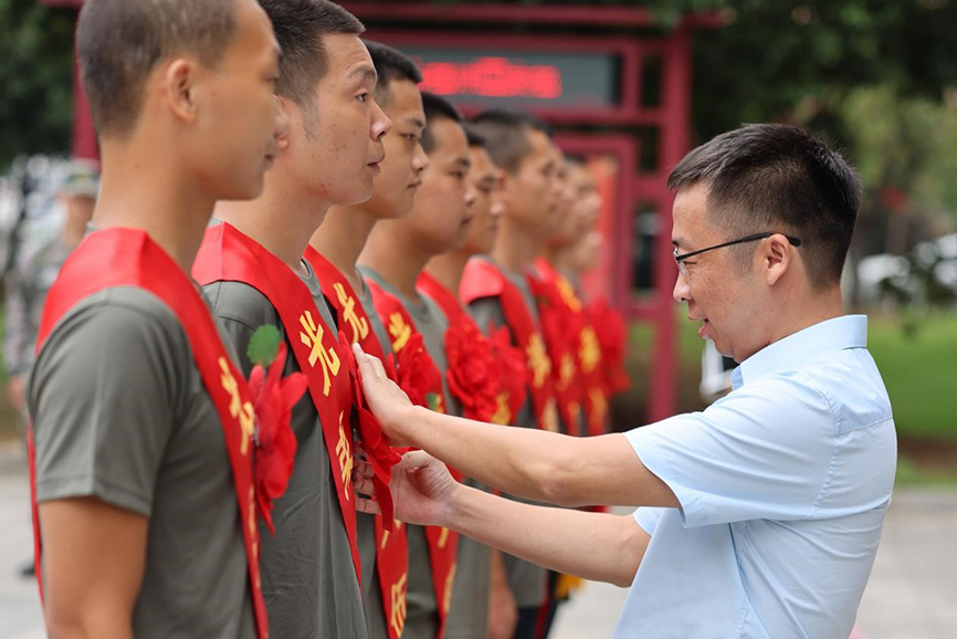 潘军代表学院向勇于接受祖国挑选,光荣入伍的12名青年学生新兵表示祝贺,并表达了对入伍新兵的殷切希望,希望大家明确政治责任,传承红色基因,坚定理想信念,站稳人民立场,苦练本领,报效祖国;严守纪律,自觉服从命令,听从指挥,尊重首长,团结互助,积极上进,努力争做“优秀士兵”;努力拼搏,以立功受奖军人为榜样、为标杆,锤炼过硬本领,努力成为“有灵魂、有本事、有血性、有品德”的新时代革命军人。