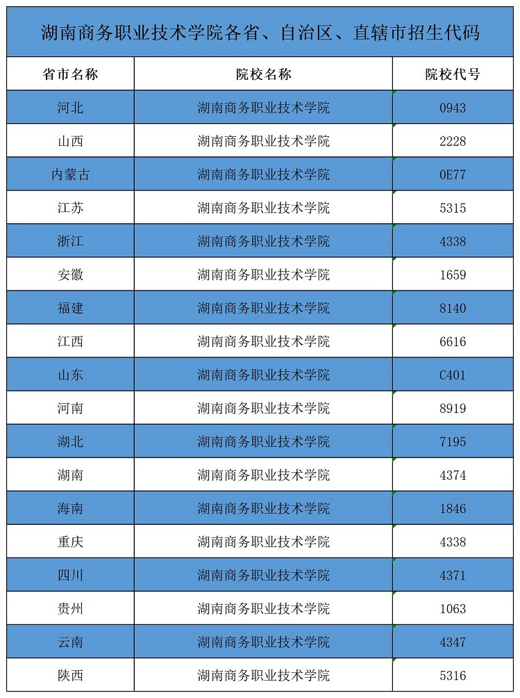 湖南商务职业技术学院各省、自治区、直辖市招生代码