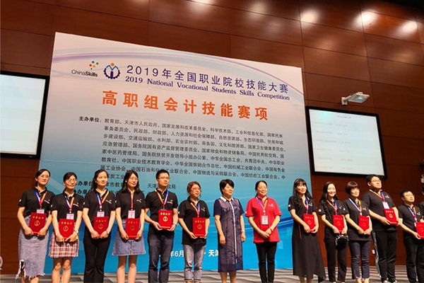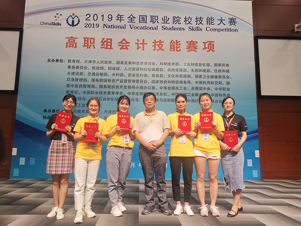 6月1日,2019年全国职业院校技能大赛高职组会计技能赛项在天津职业大学圆满落幕,来自全国的61支队伍、366名师生共同参赛。我?;峒蒲г貉钚⊙唷⒄叛乔謇鲜χ傅嫉?6会计1班唐青、周娜,16会计2班陈蓉,17会计3班刘艳4人,经过激烈角逐,力挫群雄,荣获团体一等奖第一名!