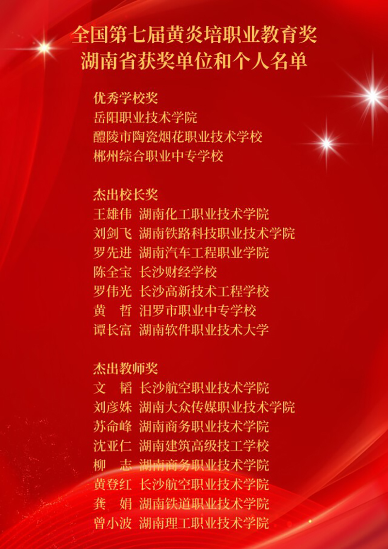 5月6日上午,第七届黄炎培职业教育奖表彰大会在北京召开,湖南省同步召开会议表彰第七届黄炎培职业教育奖湖南省获奖单位和个人。湖南商务职业技术学院教师苏命峰、柳志获得杰出教师奖。