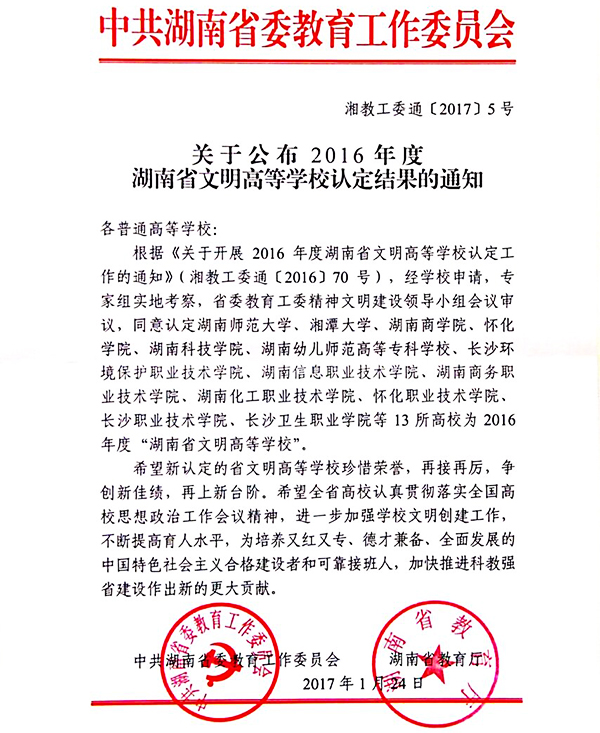 近日,湖南省委教育工委、省教育厅印发《关于开展 2016 年度湖南省文明高等学校认定工作的通知》,我院被认定为2016年度“湖南省文明高等学校”。全省共有13所高?;翊耸馊佟?/p>