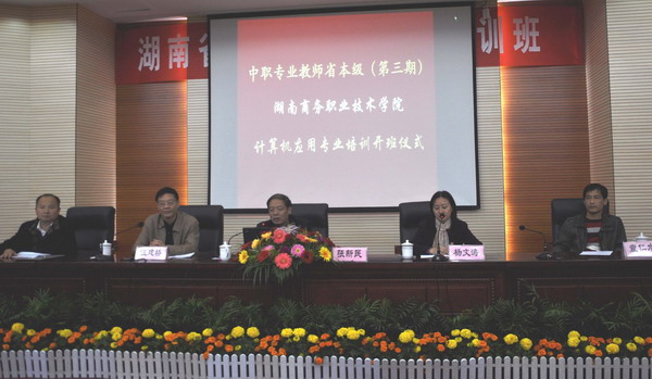 11月11日上午9:00,湖南省中等职业学校专业教师省本级计算机应用培训班开班仪式在我院办公楼学术报告厅举行,学院院长张新民、副院长杨文涛、教务处处长伍建桥,信息技术系党总支书记袁仁水等领导在主席台就座并发表了讲话,来自全省34所中职院校的37位学员及信息技术系教师代表共五十余人参加了开班仪式,会议由教务处处长伍建桥主持。