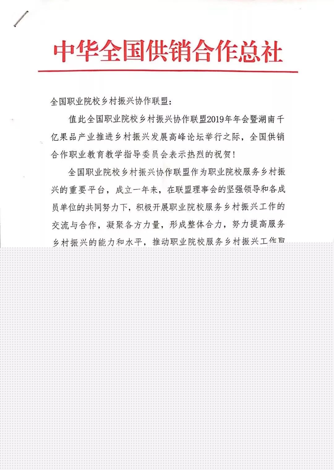 中华全国供销合作总社祝贺全国职业院校乡村振兴协作联盟2019年年会暨湖南千亿果品产业推进乡村振兴发展高峰论坛成功举办的贺信