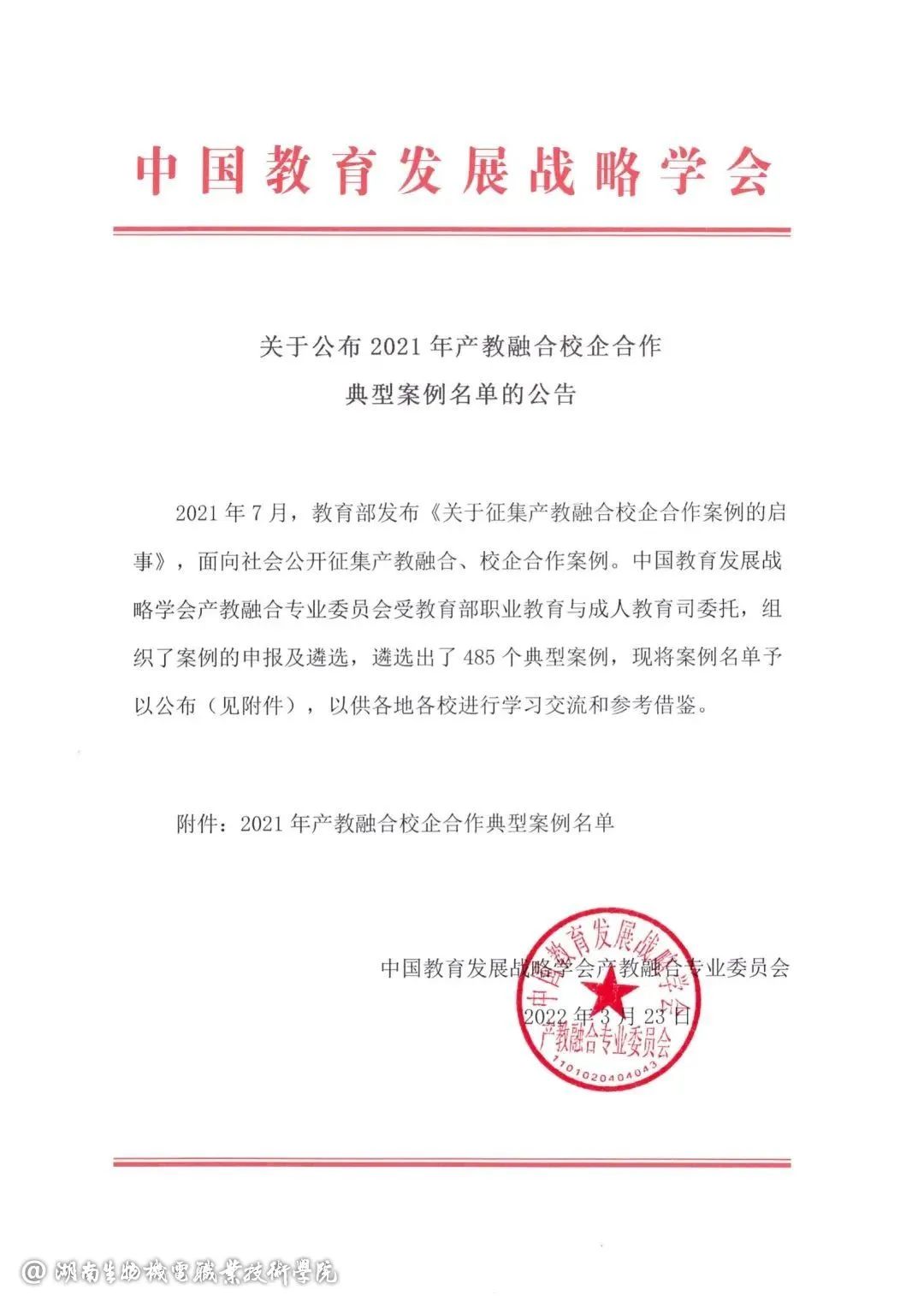 2021年7月,教育部发布《关于征集产教融合校企合作案例的启事》,面向社会公开征集产教融合、校企合作案例。中国教育发展战略学会产教融合专业委员会受教育部职业教育与成人教育司委托,组织了案例的申报及遴选,遴选出了485个典型案例,以供各地各校进行学习交流和参考借鉴。学院《跨界协同 一生一案:乡村振兴本土化人才培养研究与实践》案例被遴选为产教融合校企合作典型案例。