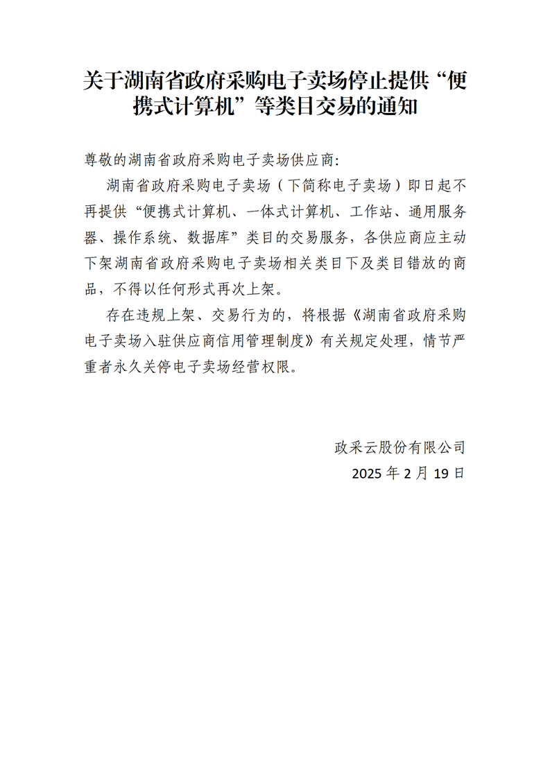 关于湖南省政府采购电子卖场停止提供“便携式计算机”等类目交易的通知