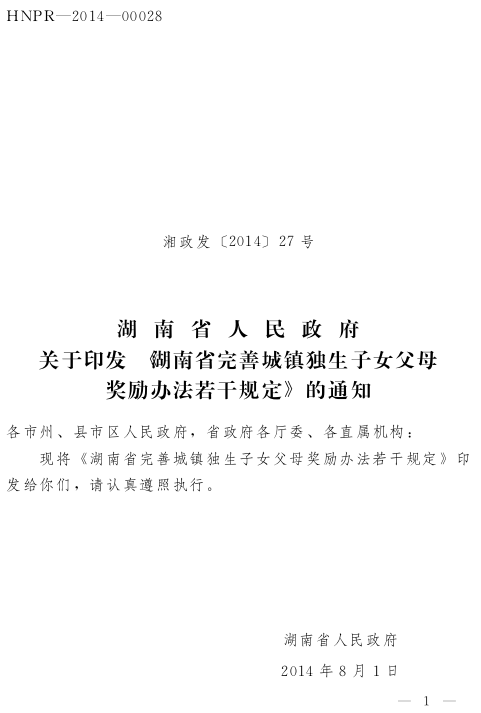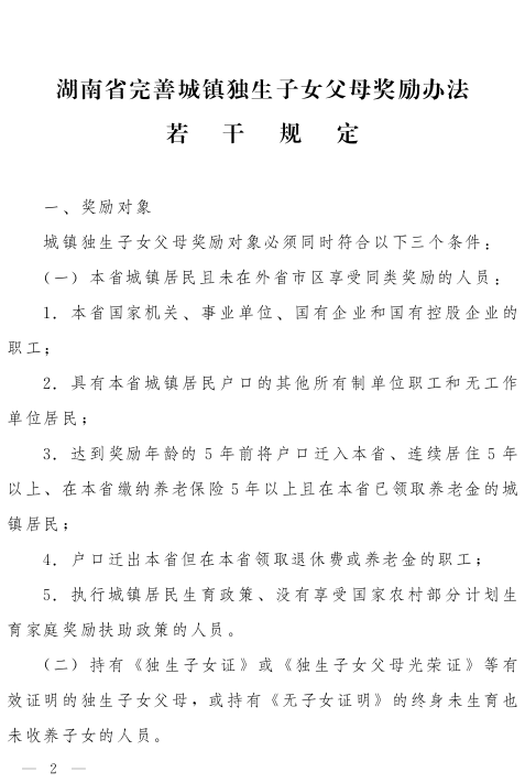 湖南省人民政府关于印发《湖南省完善城镇独生子女父母奖励办法若干规定》的通知