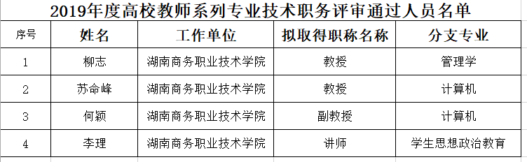 根据省职改办、省教育厅职改办通知精神,2019年我院高等学校教师系列专业技术职务评审工作已经结束。经高评会评审决定,我院柳志、苏命峰2位同志通过了教授职称的评审,何颖同志通过了副教授职称的评审(转评),李理同志通过了讲师职称的评审。现予以公示,公示期为:2019年12月25日至2019年12月31日。公示期间如有异议请向组织人事处或纪检监察室反映。